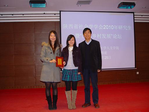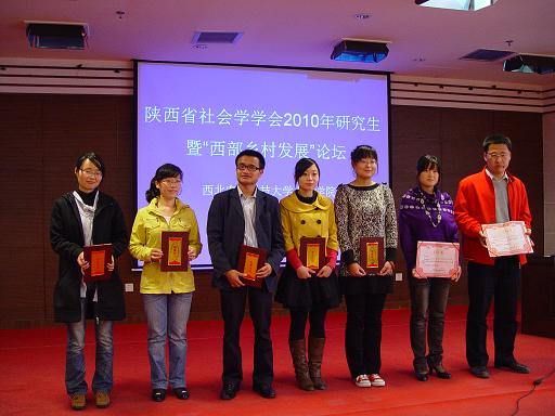 最后,大会在参加本次学术交流的50余篇论文中,通过西安交大、陕师大、西北大、西农四校社会学系专家联合评审,评选出13篇获奖文章,其中一等奖1名、二等奖2名、三等奖3名、优秀奖7名。我院王夏峥、陈煜婷同学的《城乡家长教育期望现状分析》一文荣获大会一等奖,程诚、邢瑞雪同学的《第二代农民工市民化途径实证研究》一文荣获大会二等奖,肖阳、孙坚同学的《农民工自我社会认同研究》一文荣获大会优秀奖。与会专家对获奖者进行了颁奖。陕西省社会学会2010年研究生论坛暨“西部乡村工作坊”第一次学术交流会圆满结束。