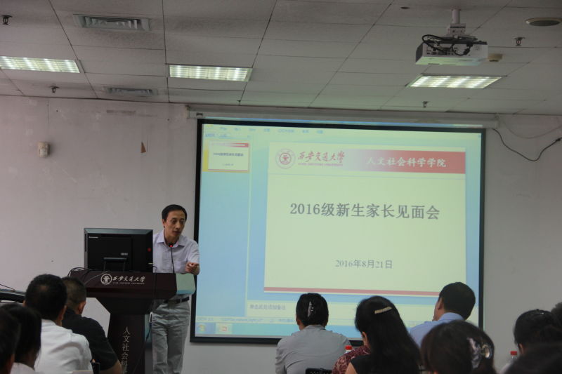在主楼E703召开了2016级新生及家长见面会。边燕杰院长,马晓彬书记,副院长李明德老师、李黎明老师、杨建科老师,副书记李重老师,院长助理薛卫真老师,中文系系主任李慧老师,书法系系主任薛养贤老师以及马克思主义学院副院长刘儒老师、燕连福老师,新生班主任及上百名新生家长参加见面会,见面会由户外露出