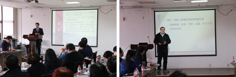 观摩交流会上,5位老师分享了自己的行的。管理学院田高良教授以管理学院为例,作了“利用交大平台,追求成功人生”的报告,他认为,小成功靠自己,大成功靠众人、靠平台。平台就是我们脚下赖以生存发展的“地板”。平台管理就是要升级我们的“地板”,超越“天花板”,突破新的格局,最终使我们达到头顶一片蓝天,脚踏一方热土的境界;金禾中心俞炜华副教授的交流主题是“基于问题导向的经济学通识课程教学”。面对非专业的学生学经济学,他提出了放弃体系、精讲核心概念和重视案例教学的通识课教学理念。