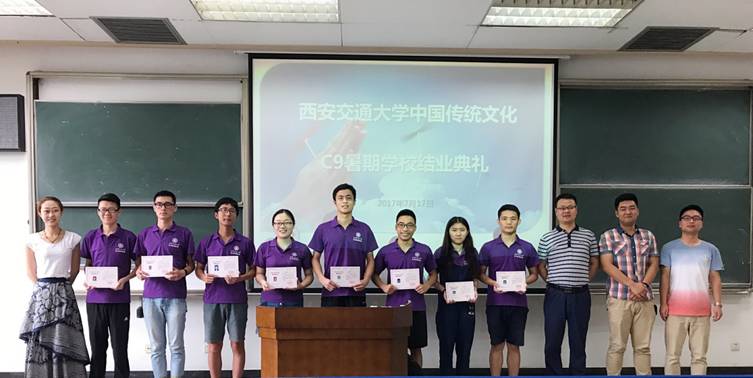 随后杨建科副院长为大家颁发了结业证书并总结到,参加暑期学校的同学们在这几天中都表现得很优秀,充分展现了C9高校联盟学子应有的风采,时间虽然短暂,但同学们已经能对西安和交大有了初步的了解,希望大家能够继续加强交流合作,把这份情谊延绵。此次暑期学校融入的中国传统文化的方方面面,对同学们,尤其是理工科的同学们影响很大,中国传统文化充满智慧、博大精深,需要同学们能潜下心来细细品味,希望各位青年才俊能够脚踏传统文化的坚实土壤,面向未来,早日成为国家栋梁。