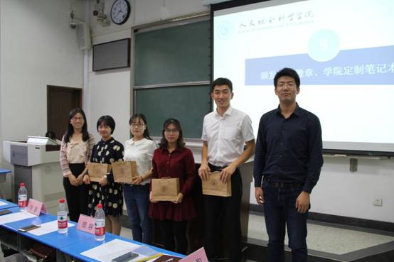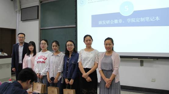 研究生会王星主席一同为本届研究生会的干事们颁发学院纪念本,授予研究生会纪念章。