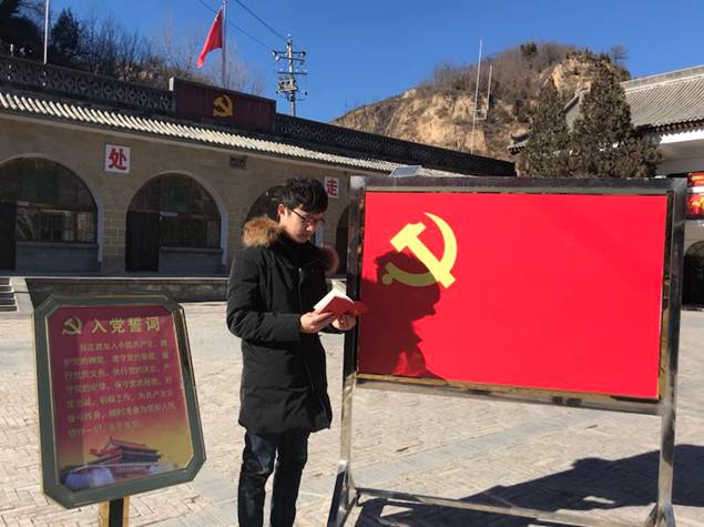 梁家河村史馆外,在支部书记曹耿献副教授的带领下,怀着对党的深厚情感,面对鲜红的党旗,全体党员左手拿着党章,高高地举起右手,重温了入党誓词:“我志愿加入中国共产党,拥护党的纲领,遵守党的章程,履行党员义务,执行党的决定,严守党的纪律,保守党的秘密,对党忠诚,积极工作,为共产主义奋斗终身,随时准备为党和人民牺牲一切,永不叛党。”