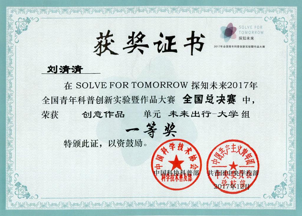大赛由中国科学技术协会科普部、共青团中央学校部主办,中国科学技术馆、中国科协青少年科技中心承办。刘清清团队在获得上海赛区冠军之后,在与其他全国十四个分赛区队伍的激烈角逐中,脱颖而出。在可行性、科学性、创新性、完整性、美观性、现场表现共六个方面得到评委的高度评价,一举夺冠。12月24日,在中央电视台新闻联播的国内联播快讯中,报道了此次大赛及其获奖情况。