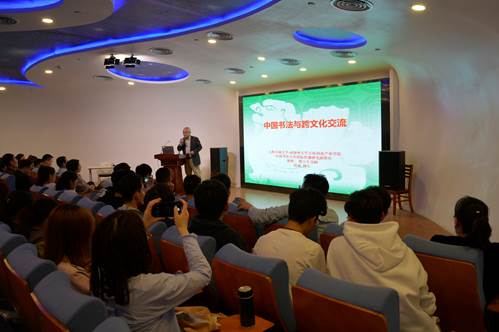 周斌教授明确指出,中国书法是“雅”“俗”共赏的文化,具有自身独特性和审美价值,最能体现中国传统文化的精神;而文化自信的精髓正在于寻找共通、引发共鸣,绝非一味迎合。在幽默而自信的讲授中,他将自身一系列海外教学案例及相关实证研究通过一个个生动的故事娓娓道出,阐述中国书法国际传播的可行性与有效性;通过对与联合国原秘书长潘基文先生的书法交流和师生情谊的讲述,展示出中国书法国际传播所取丰硕成果,并启发大家积极思考如何利用书法载体进行中国文化国际传播、促进外交交流。他热情鼓励全场交大学子,在新时代背景下更应有责任、讲担当,肩负历史使命,讲好中国故事,努力将优秀的中华文化精神传扬世界。