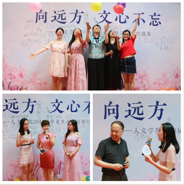 毕业生崔可嘉主持了本次毕业欢送典礼。伴随着青春欢快的音乐声红毯秀拉开帷幕,毕业生和老师们陆续走过红毯,在签字墙上签下自己的名字。有的老师和毕业生们共同走上红毯,亦师亦友的氛围感染了全场,每个人脸上洋溢着幸福的笑容,尽显人文学子风采。