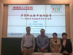 本次“锵锵四人行”教学活动以“在生死存亡面前,谁将是幸运儿”、“剩男剩女能否结秦晋之好”、“富士康连环跳背后的推手”和“医患之间相爱相杀为那般”四个话题展开激烈的学科对话。相对于经济学关注效率,社会学更加关注公平正义;相对于心理学以微观个体视角切入,社会学则从结构和文化的视角来展示社会学想象力。学生在聆听老师们基于不同学科的立场和逻辑,问题和思考不断被激发出来,加入讨论之中,直到下课铃声响起,同学们仍然意犹未尽。在最后的总结中,童梅老师说,“社会现象是复杂的,单一的认知维度会使我们变成井底之蛙,正所谓横看成岭侧成峰,只有学会多元思维,才能更加接近真理本身”。