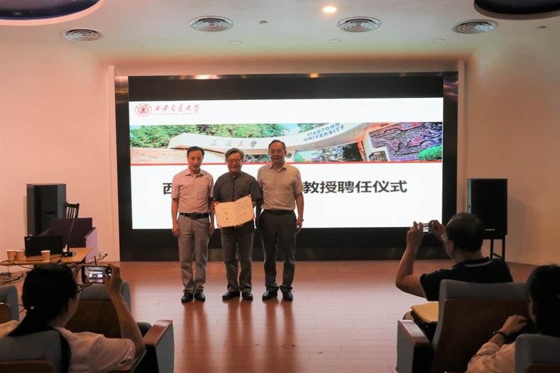 兼职教授的聘书,并和成进部长一同为肖先生颁发聘书,佩戴校徽。肖云儒先生表达了对聘任为兼职教授的感激之情,并表达会尽己所能,为西安交大的建设和发展继续做贡献。