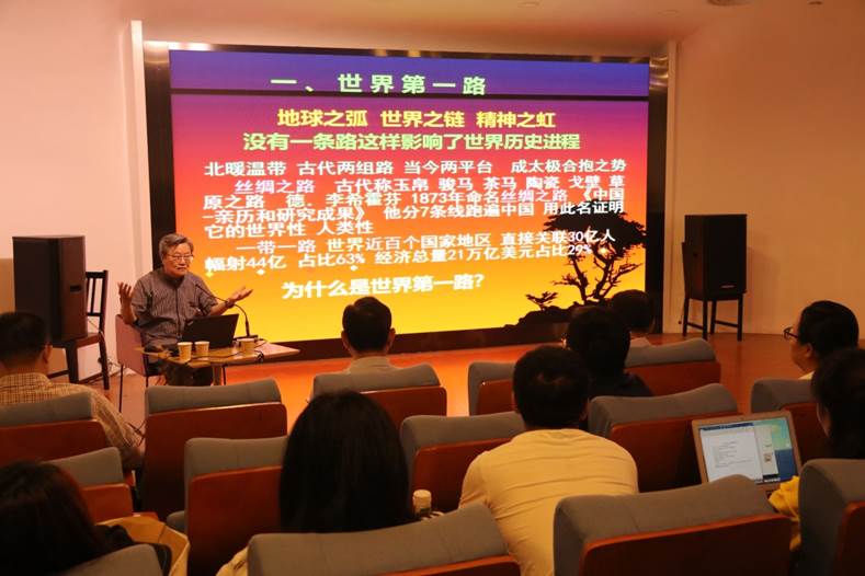 聘任仪式后,肖云儒教授为师生做“思源”讲书堂第二十四期专题讲座,主题为“地球之虹—‘一带一路’与文化自信”。他提出“一带一路”是“丝路当代版”,是世界第一路,没有一条路这样影响了世界历史进程。并总结了“一带一路”的三大特征:一是地球之虹;二是世界之链;三是精神之虹。他分享了自身游历“一带一路”沿线国家的深切体会,言语之间,作为中国人的骄傲自豪之情溢于言表,同时也指出丝路沿线国家的普通人民对中国的认识范围愈加广泛,其对“丝路精神”的了解也愈加深入。肖云儒教授认为,“丝路精神”就是和平合作、开放包容、互学互鉴、互利共赢的精神,其需要和平和谐的内外环境、借助合作互补的方式,最终必定是发展共赢的成果。我们要继续坚持走出去、谋发展,打造全方位对外开放新格局,拉起手创造新的发展机遇。