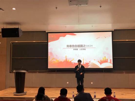 不同于他人,他以一种分享的形式展开了自己的演讲。他用5W2H(what、why、when、where、who、how、how much)的思路展示了自己对爱国的思考和感悟,以青年之声诉说了对祖国母亲的热爱之情。