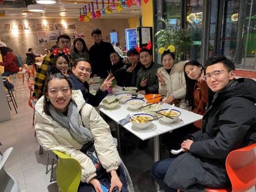 党委副书记王劲老师、辅导员闫潇老师、刘蓓老师与同学们一起共享新年第一顿宵夜,人文大家庭欢聚一堂,其乐融融。