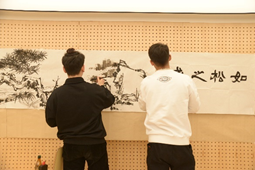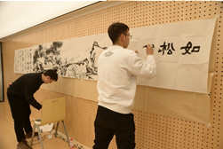 画面中,一棵松针叶繁盛,斜挑而出,傲然于山河之间,右侧题有“如松之盛”,左侧题有唐代李群玉的《书院二小松》诗一首。绘画由硕9108班李明韬同学现场泼墨而成,书法由硕9108班周正同学题写。作品意在表达做一个如松一般的人,即使环境恶劣依旧风骨依然,如同在大西北扎根的交大一般,果毅力行,忠恕任事。悠悠琴声中,张迈曾书记和王树国校长为书画作品盖下了“饮水思源”和“西迁新传人”印章,对作品给予了极大的肯定。