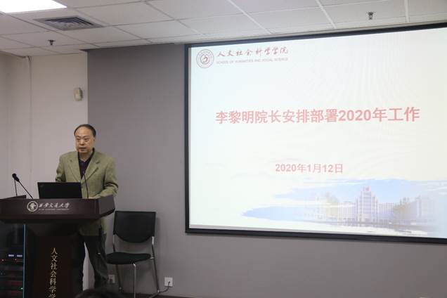 李黎明院长对2020年学院工作进行安排部署。2020年,学院要继续加强思想文化建设,全院上下同心,凝心聚气,营造奋斗进取的良好氛围。在人才培养方面,要继续开展好“精彩一门课”活动,加强课堂建设。同时提升研究生论文发表量,强化研究生培养工作;在学科建设方面,要成立学科评估筹备小组,认真梳理成果,为第五轮学科评估和“双一流”评估做好准备工作;在队伍建设方面,要以“青秀人才”计划为契机,做大队伍体量,加强队伍建设;在创新港建设方面,要结合“跑五”工作,落实研究中心,加强智库建设,积极为国家和地方发展建言献策;在科研工作方面,要对标2019年目标,认真梳理完成情况。在2020年继续以绩效改革为抓手,提升教师科研能力。最后,全院要围绕起草“十四五”规划工作,全员参与,人人出彩,共同为学院的发展贡献力量。