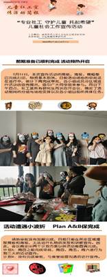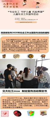 2019级社会工作硕士研究生于2020年6月1日正式启动以“专业社工守护儿童托起希望”为主题的社会工作宣传周活动,以提高高校师生对社会工作专业认知度,增加儿童关爱保护的政策知识。