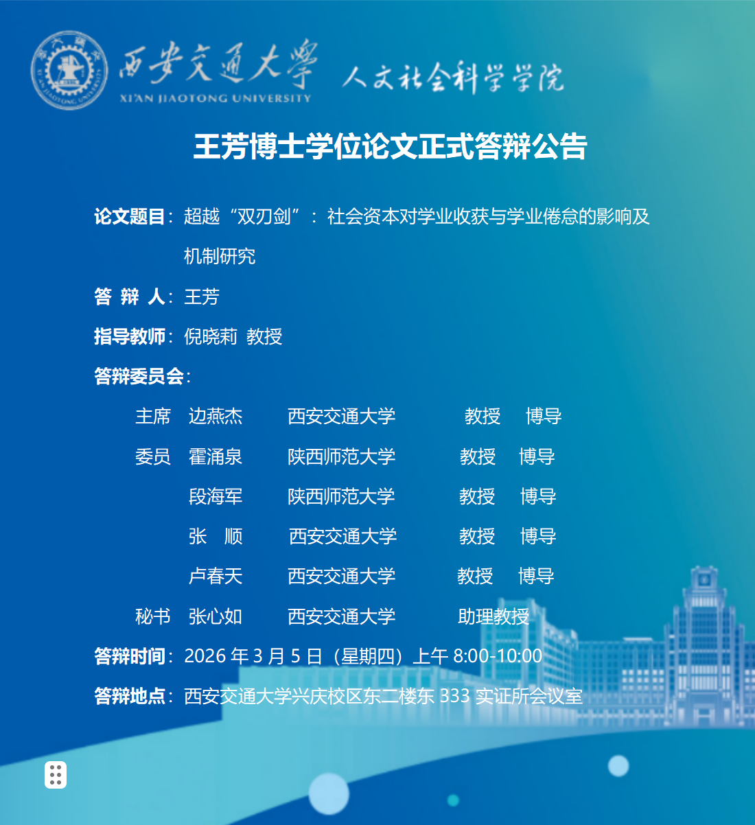王芳博士学位论文正式答辩公告